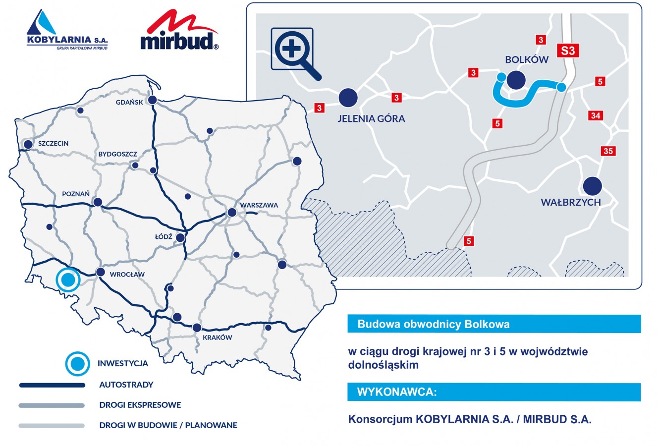 Zaprojektowanie i budowa obwodnicy Bolkowa w ciągu drogi krajowej nr 3 i 5 w wojwództwie dolnośląskim. Inwestycja została oddana do użytku w grudniu 2019 roku - 4 miesiące przed upływem terminu umownego.